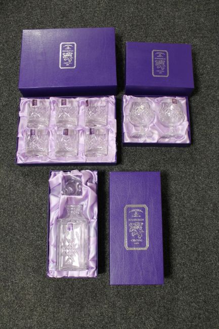 A boxed Edinburgh crystal decanter, boxed set of Edinburgh whisky glasses and pair of brandy glasses