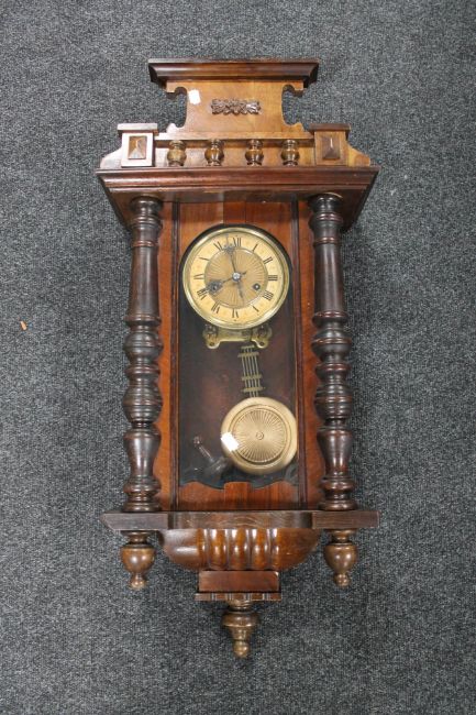 A Victorian stained beech wood wall clock with pendulum