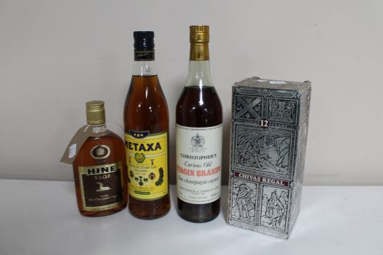 A bottle of Chivas Regal Blended Scotch Whisky 26 fl. oz, in box, together with a bottle of Christopher's Curious Old Virgin Brandy 70cl, Metaxa Greek Spirit 70cl and a bottle of Hine Cognac 50cl (4)