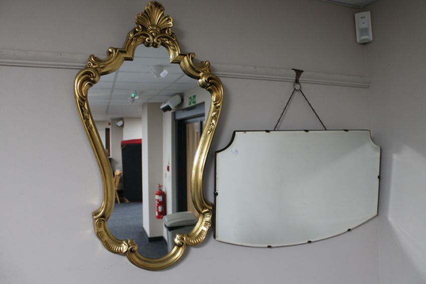 A 1930's frameless mirror together with a decorative gilt framed mirror
