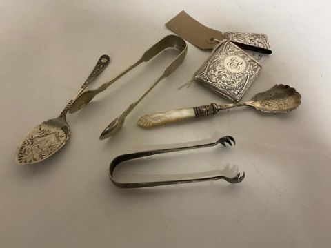 A Birmingham silver card case 1920, together with two sets of plated sugar tongs and two plated spoons