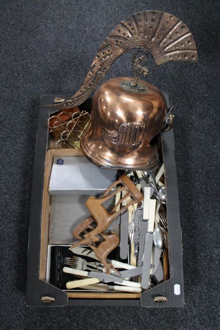 A box of copper Gladiator style helmet, carved wooden animal figures, quantity of flat ware etc