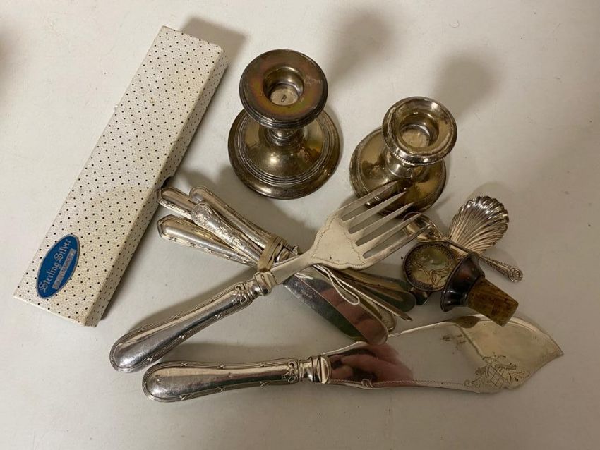 A box of silver pieces, pair of candlesticks, silver handled cheese knife in box, silver handled cake slice, seven silver handled butter knives etc
