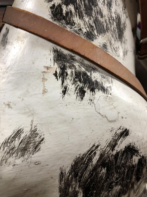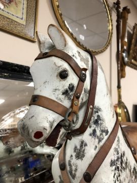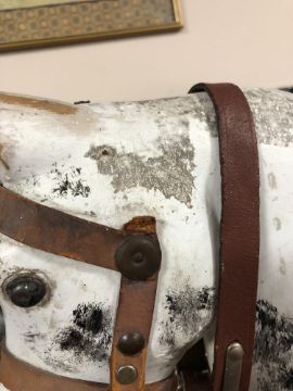 100cm long by 70cm high by 46cm wide. Typical paint scratches, chips and flakes all over the body. Piece of leather strap broken off bridle. Otherwise generally in good condition, quite sturdy and the hinges work well. See additional images.