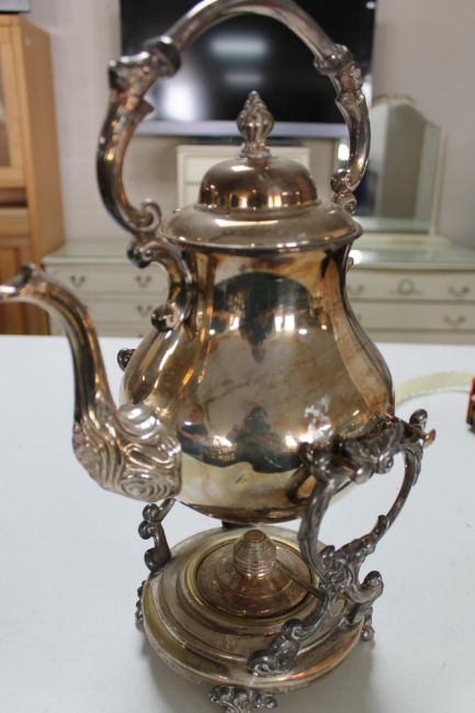 A silver plated spirit kettle on stand