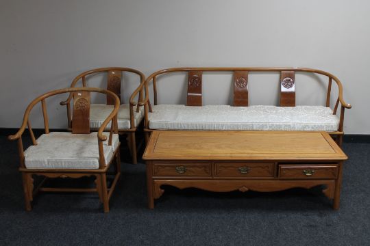 An Oriental style three piece lounge suite comprising four seater settee, pair of armchairs and low coffee table