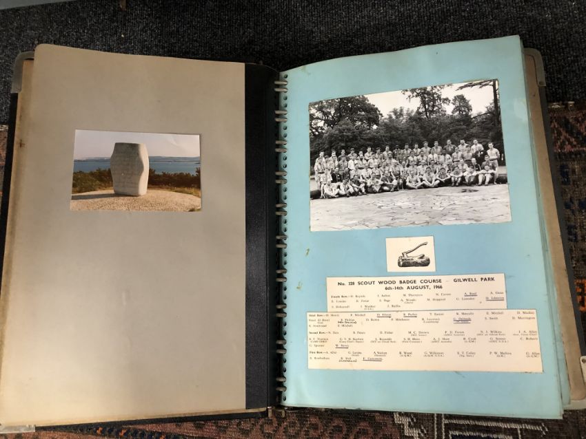 A folder of Scouting memorabilia, two Scout shirts with badges