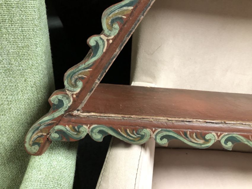 A blonde oak dressing table stool and a painted triangular wall shelf