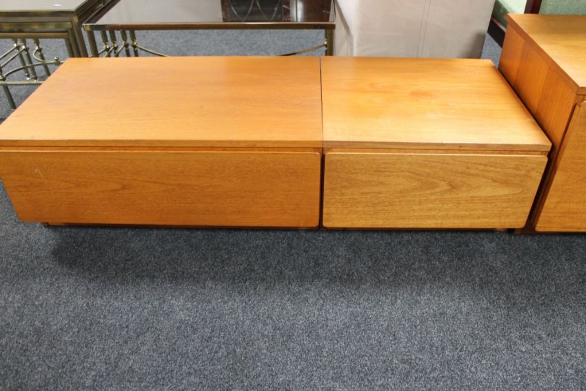 Three teak storage cabinets fitted with drawers and cupboard doors