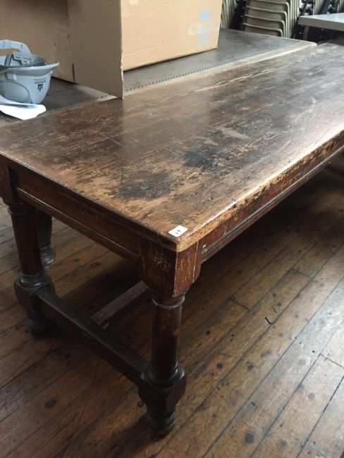 A 19th century pine table, 74 cm x 272 cm. CONDITION REPORT: All lots in this sale are part of the refurbishment of Newcastle Cathedral Church of St. Nicholas. All items are sold 'As Seen' with faults and imperfections as found. The refurbishment of the site means that any access to either view the lots or collect the lots post sale must be done by appointment only, any persons attending the site without this prior arrangement will not be granted access under any circumstance. Anyone bidding on these items must have the capability of collecting the items in person, there are no staff on-site to help move or load vehicles. All items bought in this auction must be collected from the site by no later than Friday 20th March. Any questions regarding items in this sale please email guy@millersauctioneers.co.uk or call 0191 265 80 80.