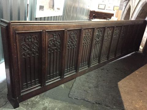 A carved oak front rail, length 336 cm, height 86 cm. CONDITION REPORT: All lots in this sale are part of the refurbishment of Newcastle Cathedral Church of St. Nicholas. All items are sold 'As Seen' with faults and imperfections as found. The refurbishment of the site means that any access to either view the lots or collect the lots post sale must be done by appointment only, any persons attending the site without this prior arrangement will not be granted access under any circumstance. Anyone bidding on these items must have the capability of collecting the items in person, there are no staff on-site to help move or load vehicles. All items bought in this auction must be collected from the site by no later than Friday 20th March. Any questions regarding items in this sale please email guy@millersauctioneers.co.uk or call 0191 265 80 80.