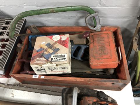 A plastic storage box containing saws, joint master, chisels etc