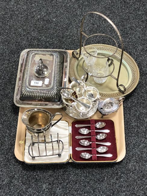 A tray of silver plated entree dish, milk jug, toast rack, boxed set of tea spoons, cruet etc