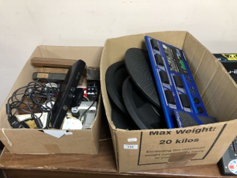 Four Alesis cymbals for a digital drum kit together with a Digitech RP-7 Valve together with another box containing Xbox 360 Kinect, electricals etc