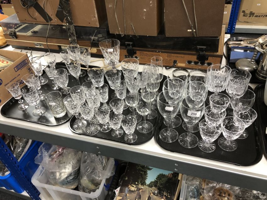 Three trays of twentieth century cut glass, wine glasses, champagne flutes, whisky tumblers etc