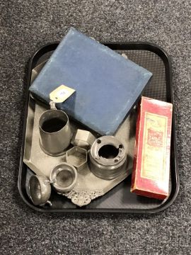 A tray of cased cutlery and antique pewter, tankard, napkin rings, inkwell etc