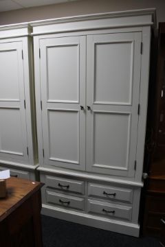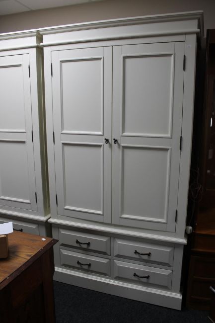 A contemporary white double door wardrobe fitted with four drawers