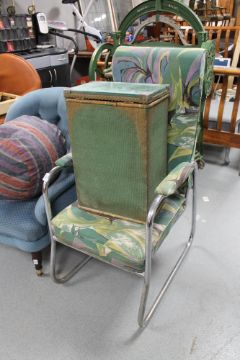 An oak coffee table, A tubular metal armchair and a linen basket