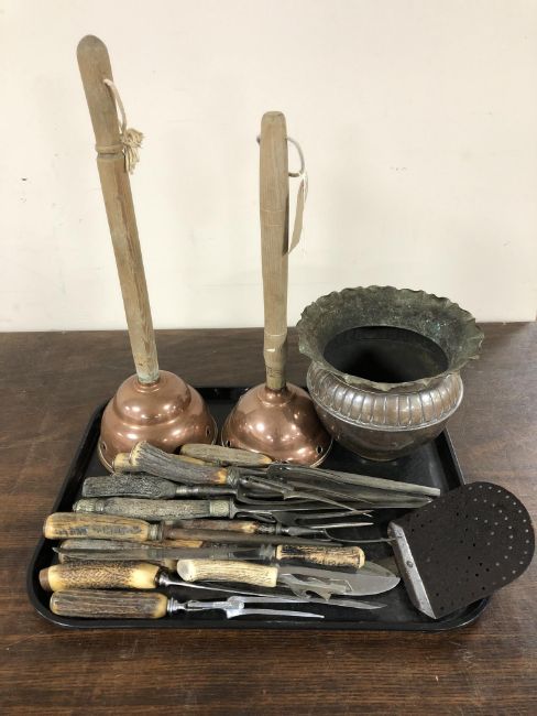 A tray of quantity antler handled cutlery, two copper poss sticks, copper jardiniere etc
