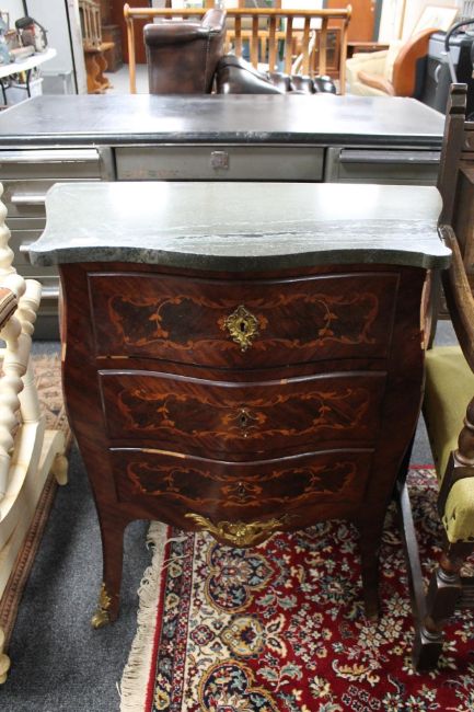 A continental inlaid walnut bombe style marble topped three drawer chest