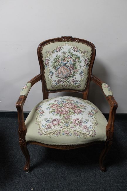 An antique style carved walnut armchair in tapestry fabric