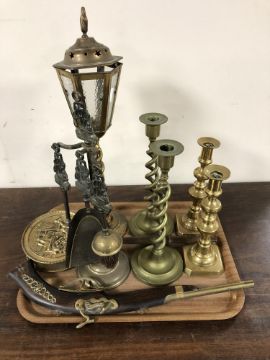 A tray of ornament percussion cap pistol, fire side companion set, two pairs of brass candlesticks, brass lamp in the form of a street light etc