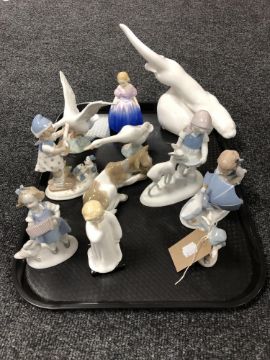 One goose with loss to beak. Girl feeding deer - loss to deer's ear. Boy carrying birds - loss to one bird's beak. Others appear good.