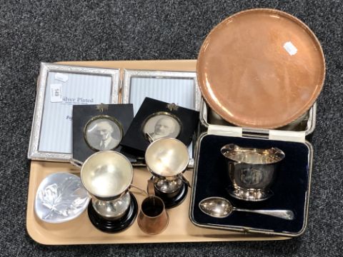A tray of silver plated photo frame, miniature copper jug, copper tray etc, framed portraits etc