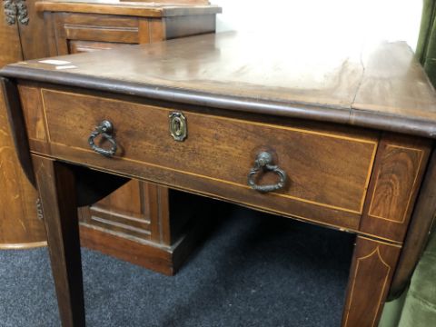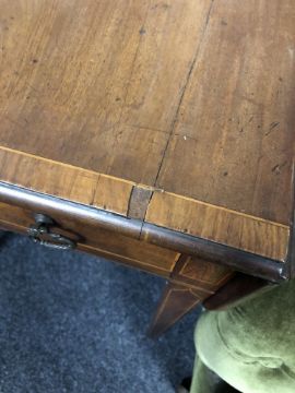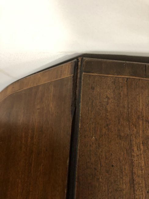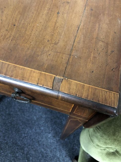 Historic split to top as well as several minor veneer losses. Handles later. One drawer is a dummy, the opposite side real. See images.