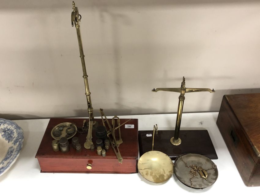 Two part sets of mahogany and brass scales together with a quantity of brass weights