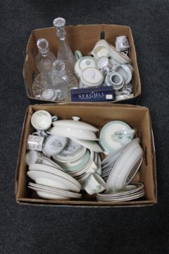 Two boxes of assorted tea and dinner china, pressed glass decanter, fruit bowl etc.