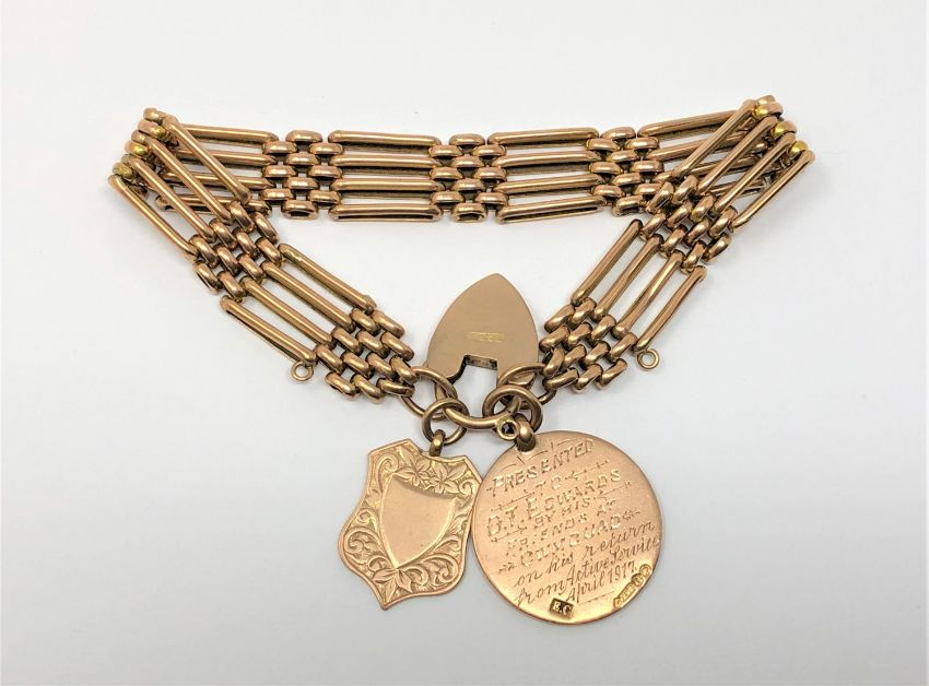A 9ct gold gate bracelet with two 9ct gold fobs attached, 23g.