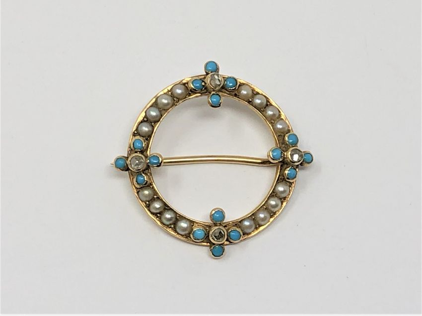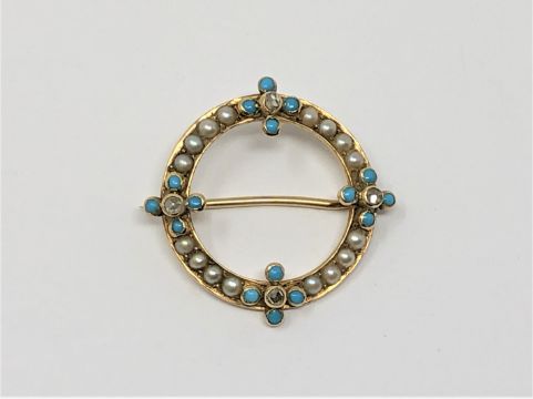 An antique yellow metal (tests 15ct gold) pearl turquoise and diamond brooch, 5.85g.