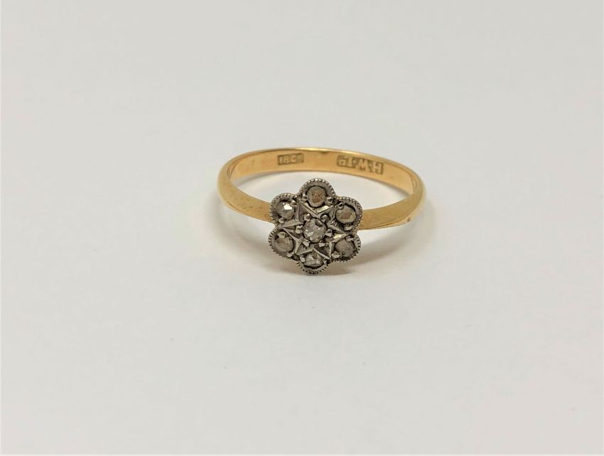 An 18ct gold seven stone diamond cluster ring, size K, 2.1g.