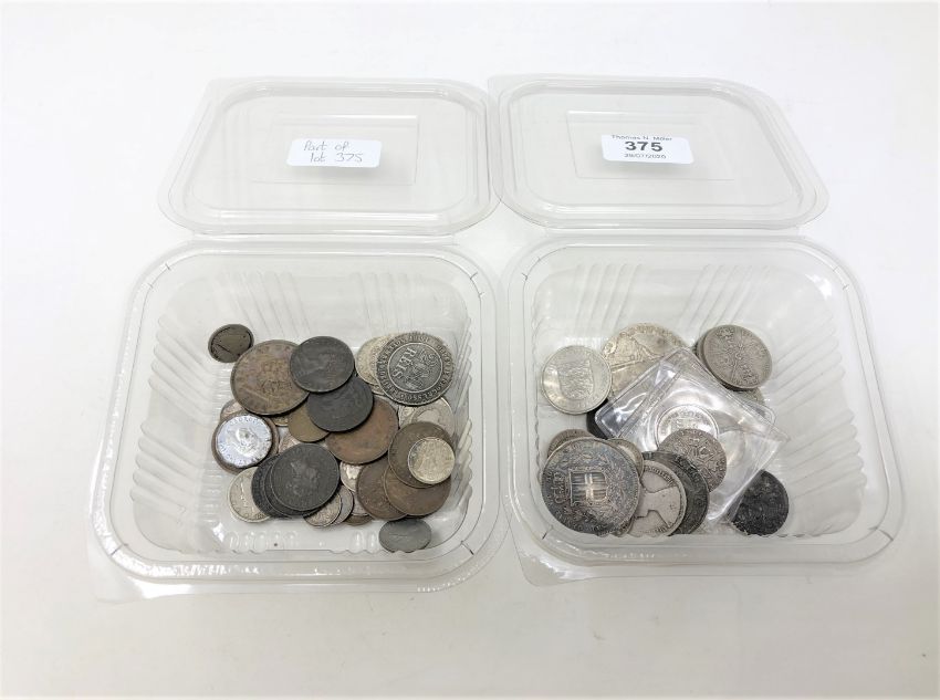 A tub of miscellaneous British coins including a Charles II 1st issue shilling (poor), Victorian florins, Georgian coins etc (approx. 28), and a tub of North and South American coins; USA, Brazil, Canada etc (approx. 43).