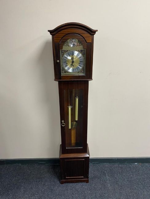 A reproduction mahogany granddaughter clock