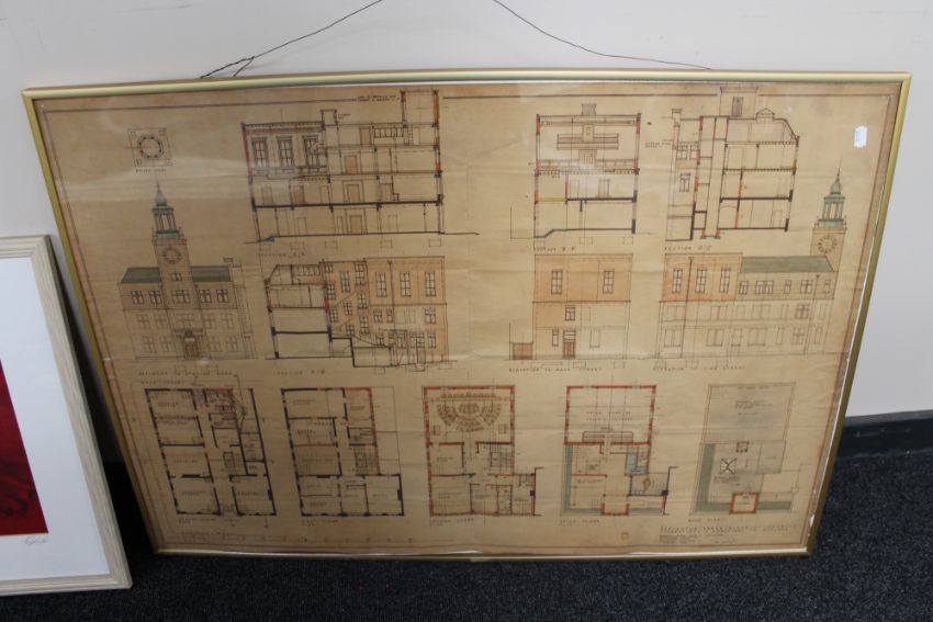 A collection of pictures and prints - blue print maps etc