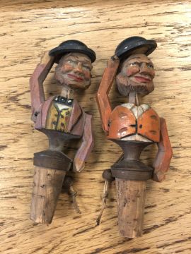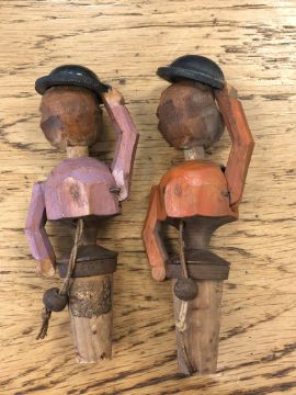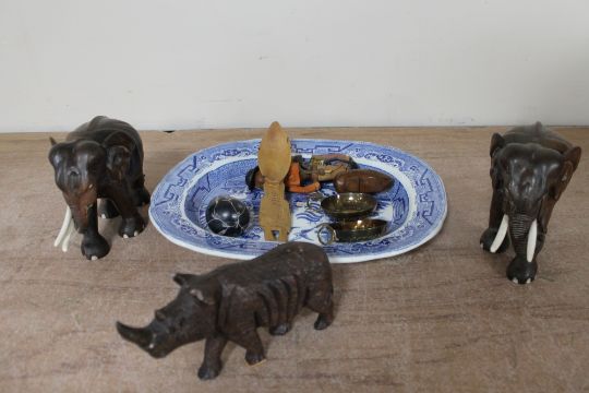 An antique willow pattern meat plate, two early 20th century novelty German wooden bottle stoppers, carved wooden elephants