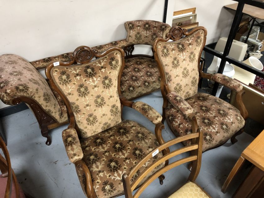 An Edwardian three piece carved mahogany lounge suite - Chaise longue and pair of armchairs