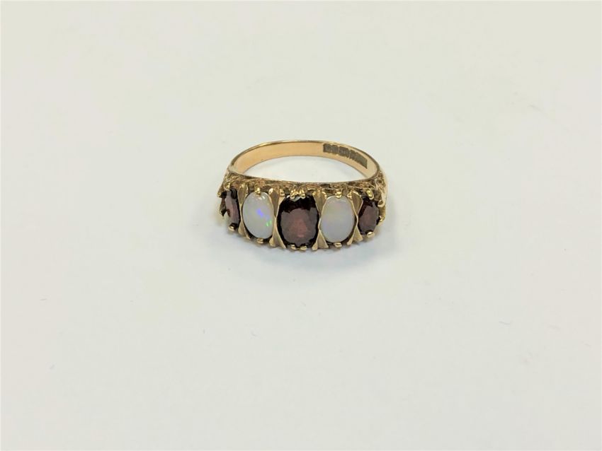 A 9ct gold opal and garnet ring, size M