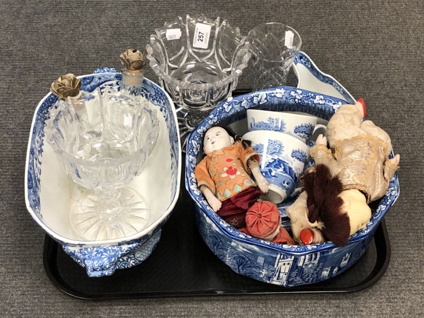 A tray of pair of cut glass pedestal dishes, other glass ware, Spode blue and white china, dolls, Venetian cloth brooch.