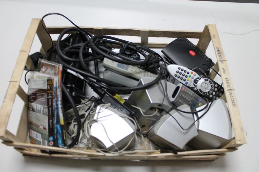 A crate of electrical items - Toshiba speakers etc
