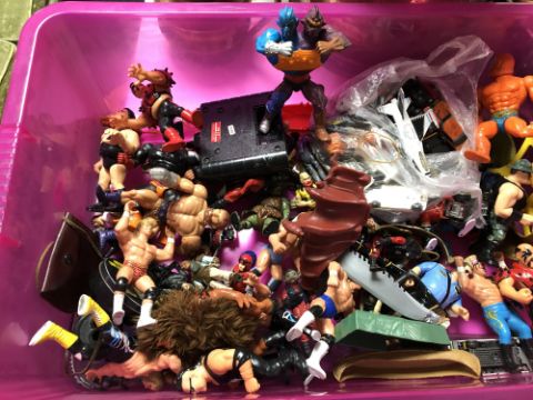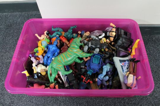 A crate of plastic Action figures and toys