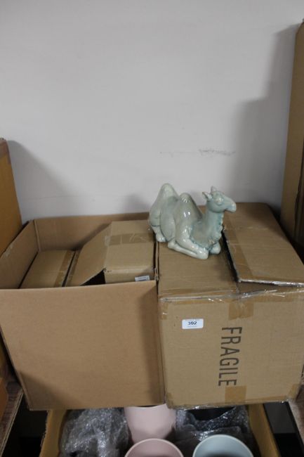 Two boxes of china ornaments and ceramic mugs