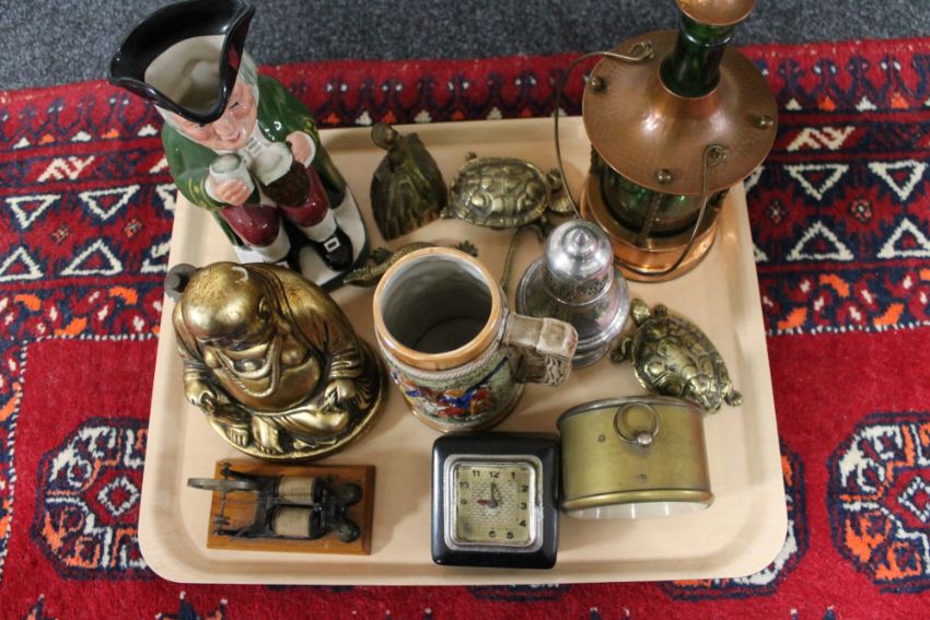 A tray of two clocks, miniature electric wheel, Toby jug, Buddha figure etc