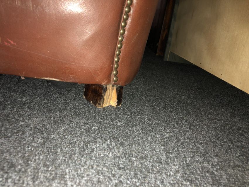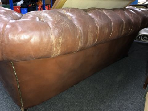 Several splits in the leather, as photographed. Leather also faded and wrinkled in areas. Some losses to the feet. 215cm long by 98cm deep by 77cm high.