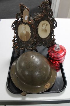 A pair of Art Nouveau style picture frames, warden helmet and cranberry glass dish