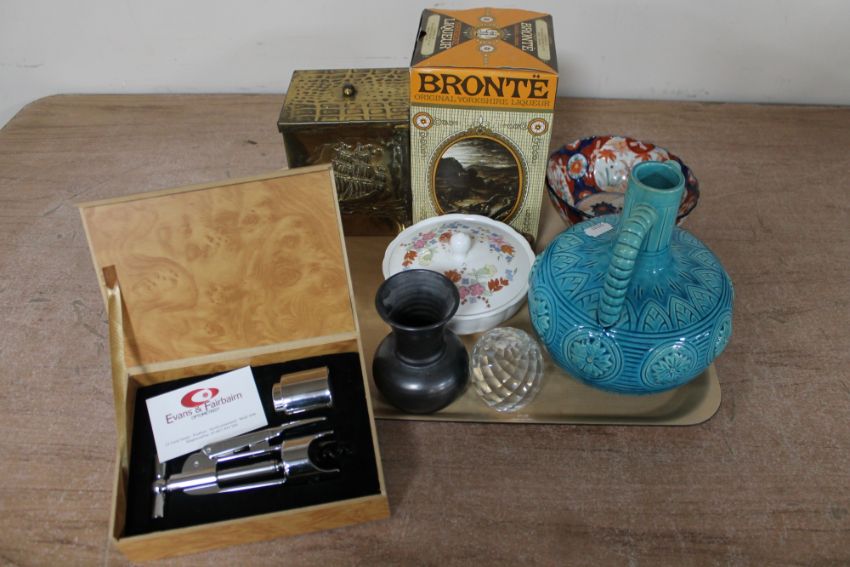 A 19th century turquoise twin handled urn together with bar top instrument, Yorkshire liqueur etc