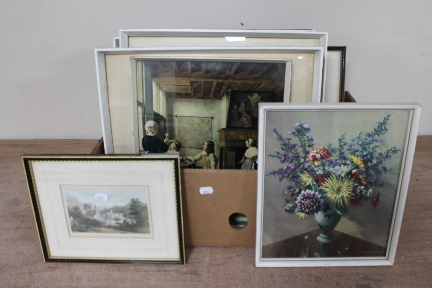 Two boxes of pictures, prints, map of Northumberland, coloured engraving etc