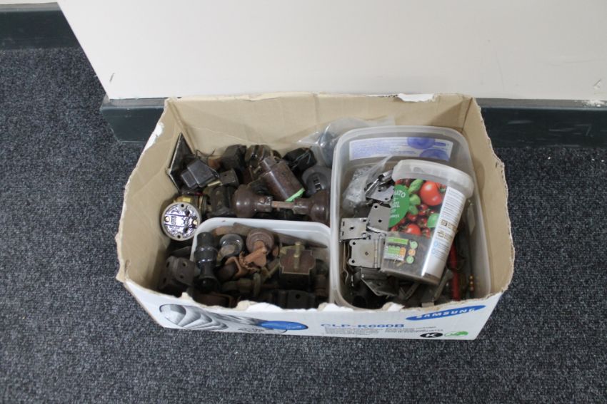 A box of Bakelite fittings, electrical fittings, metal castors etc